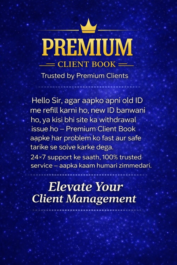 Hello sir, if you need to refill your old ID, create a new ID, or face any withdrawal issue on any site – Premium Client Book will solve every problem quickly and safely.With 24×7 support and 100% trusted service, your work is our responsibility.